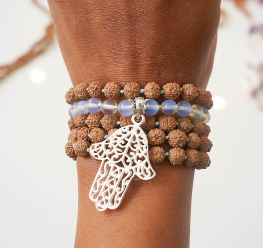 Mala: silver plated hamsa + moonstone