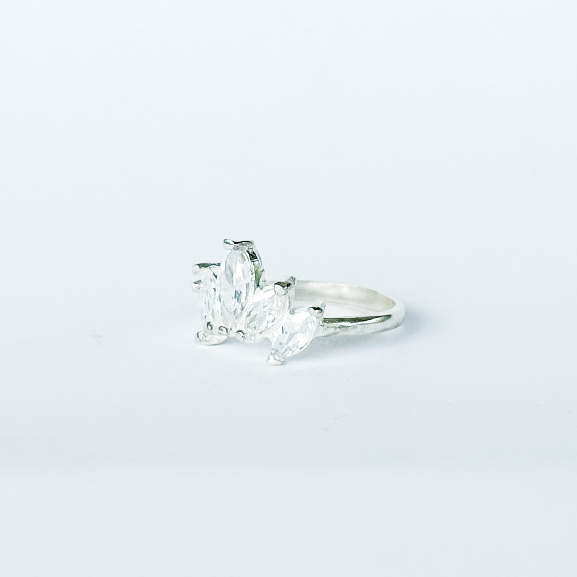 The Aurora Bloom Ring is pure sparkle — elegant, bright, and full of light. It’s made with a crown of faceted marquise-cut clear quartz, so it catches and reflects light from every angle. Honestly, it looks like tiny crystal petals wrapped around your finger — delicate but totally eye-catching.