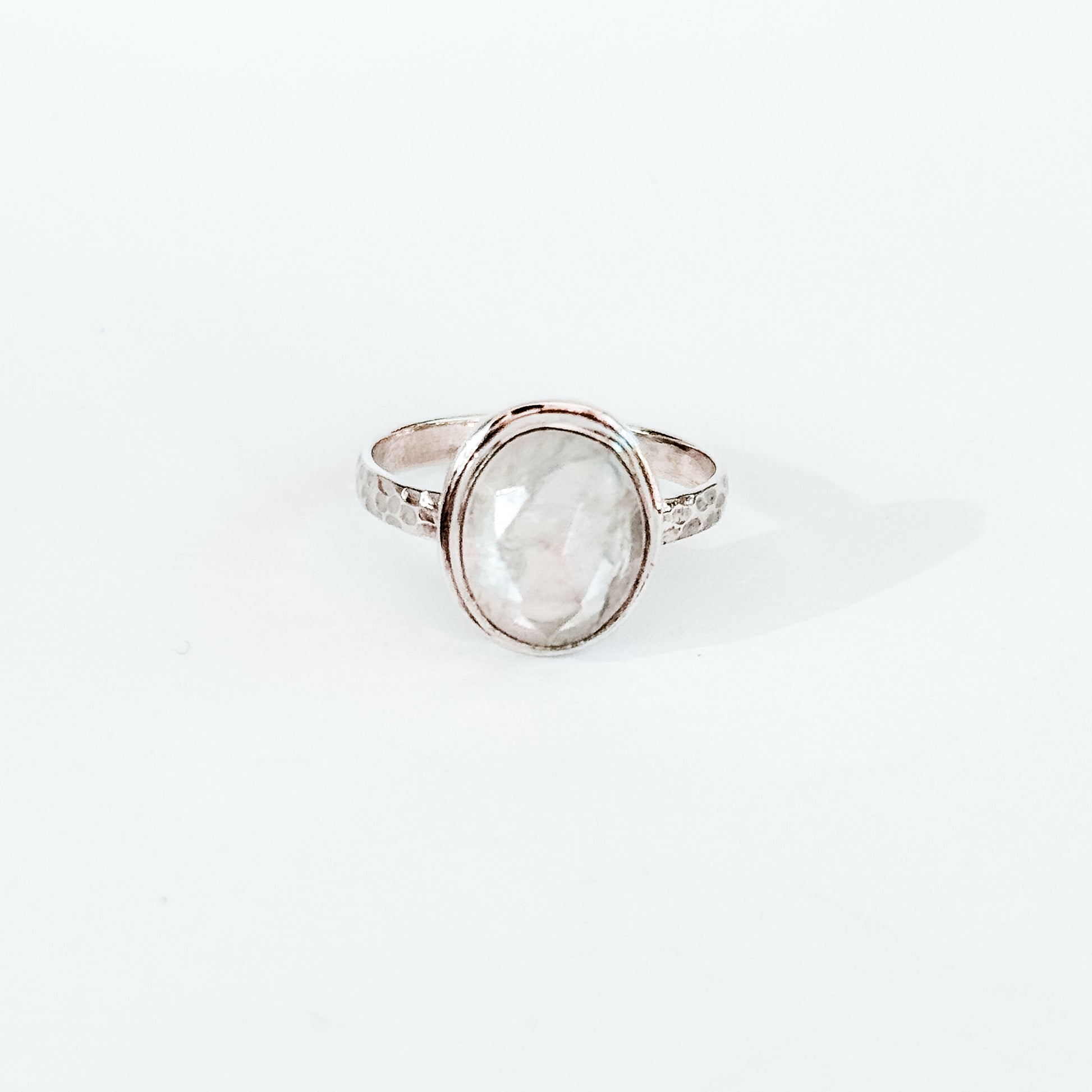 Moonstone is known as a stone of intuition, feminine energy, and new beginnings, making this ring feel just as meaningful as it is beautiful. Paired with a wide hammered silver band, it’s bold yet elegant, earthy yet ethereal — the perfect everyday statement piece.