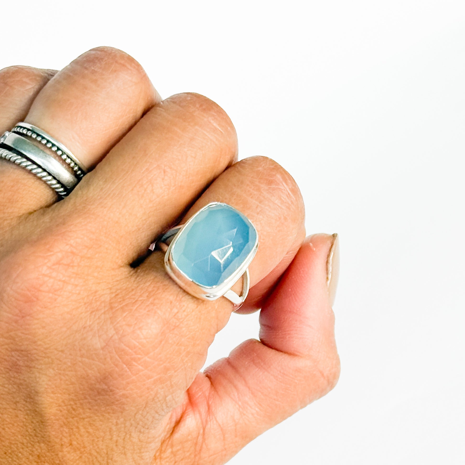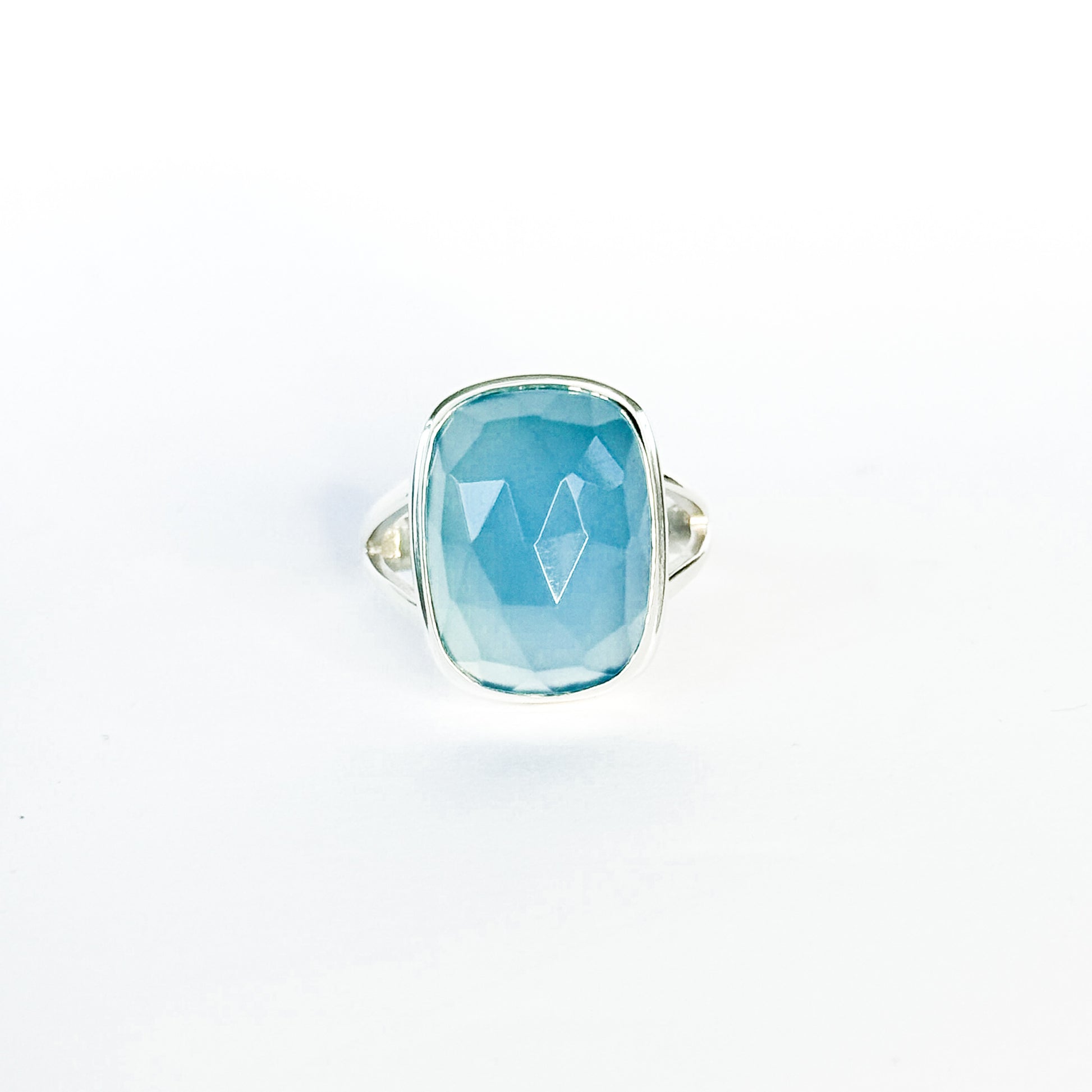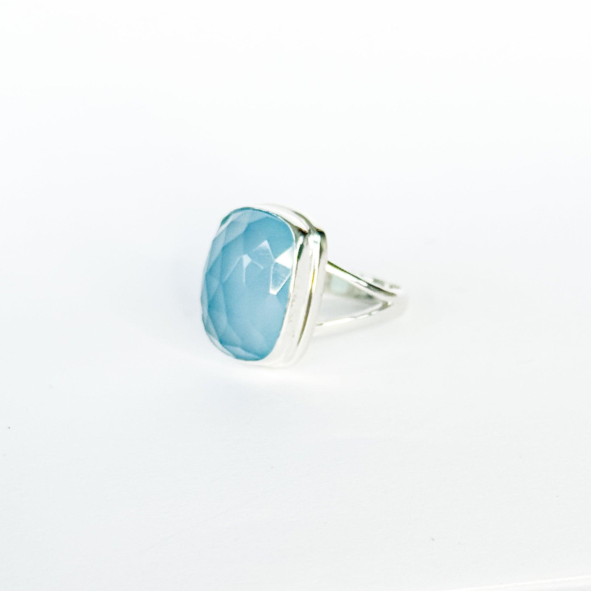 We used a large faceted blue chalcedony here, and this piece glows with that dreamy, milky-blue color that feels both royal and calming. The faceting brings the stone to life, reflecting light in the most subtle, beautiful way. We always try and source as many faceted stones as we can for this reason ;)