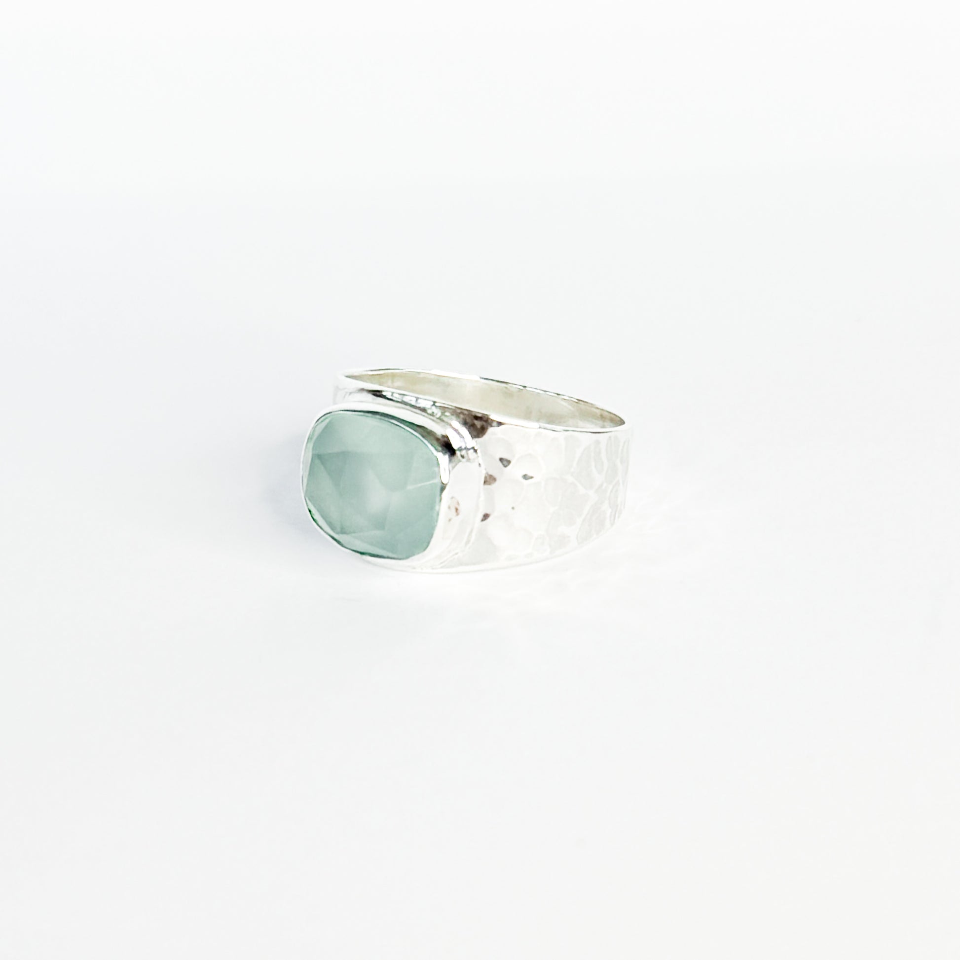 At the center is a faceted aqua chalcedony gemstone, set horizontally on a wide, hammered sterling silver band that gives the perfect mix of texture and shine.