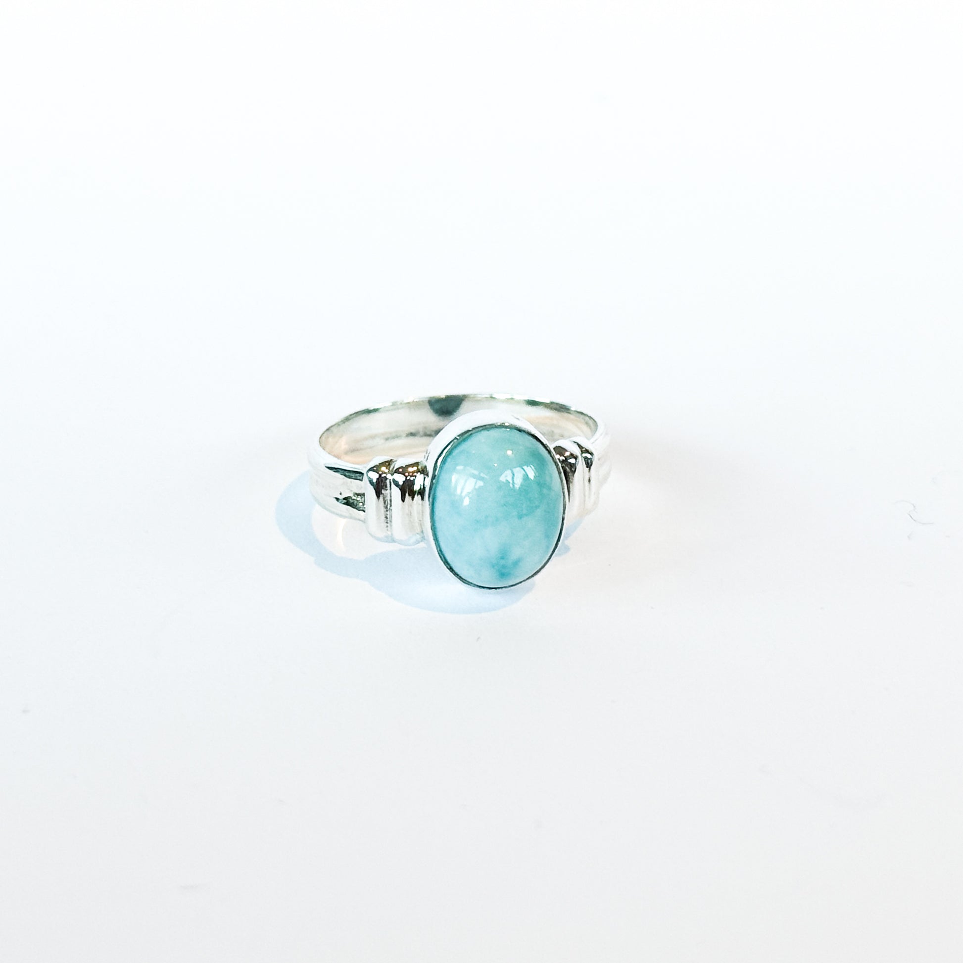 The oval Larimar stone glows in soft shades of blue and white — like sunlight reflecting off calm Caribbean waves.