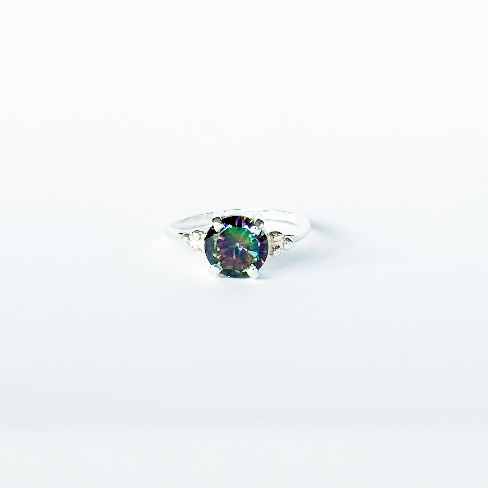It features a round mystic topaz that flashes with every color of the rainbow depending on how the light hits it — greens, purples, blues, and golds all shimmering together. It’s delicate, pretty, and has that subtle sparkle that makes it feel a little bit otherworldly.