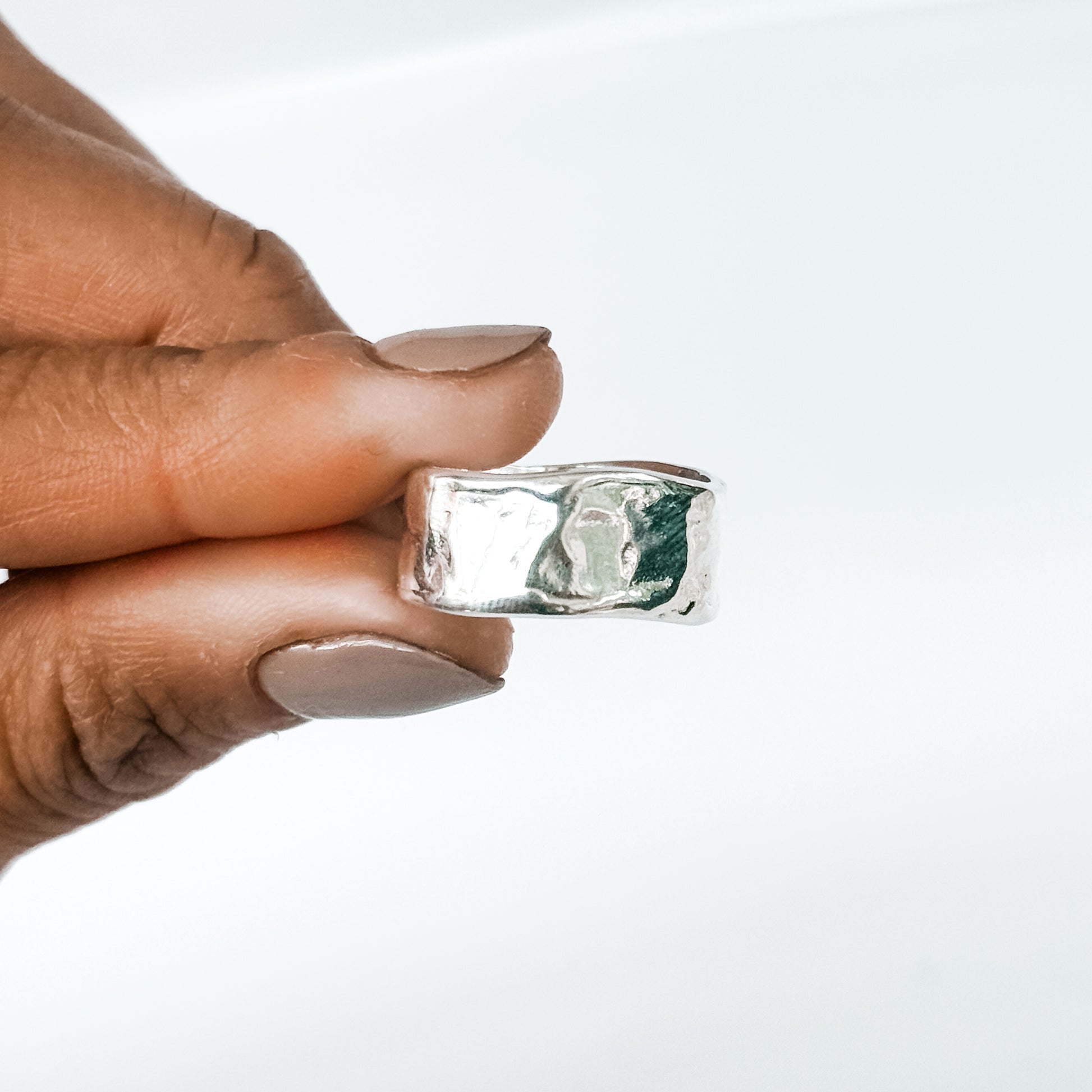 Hand-made, like all our rings from pure 925 sterling silver, this wide, chunky band has an abstract, hand-hammered texture that makes each ring truly one of a kind.