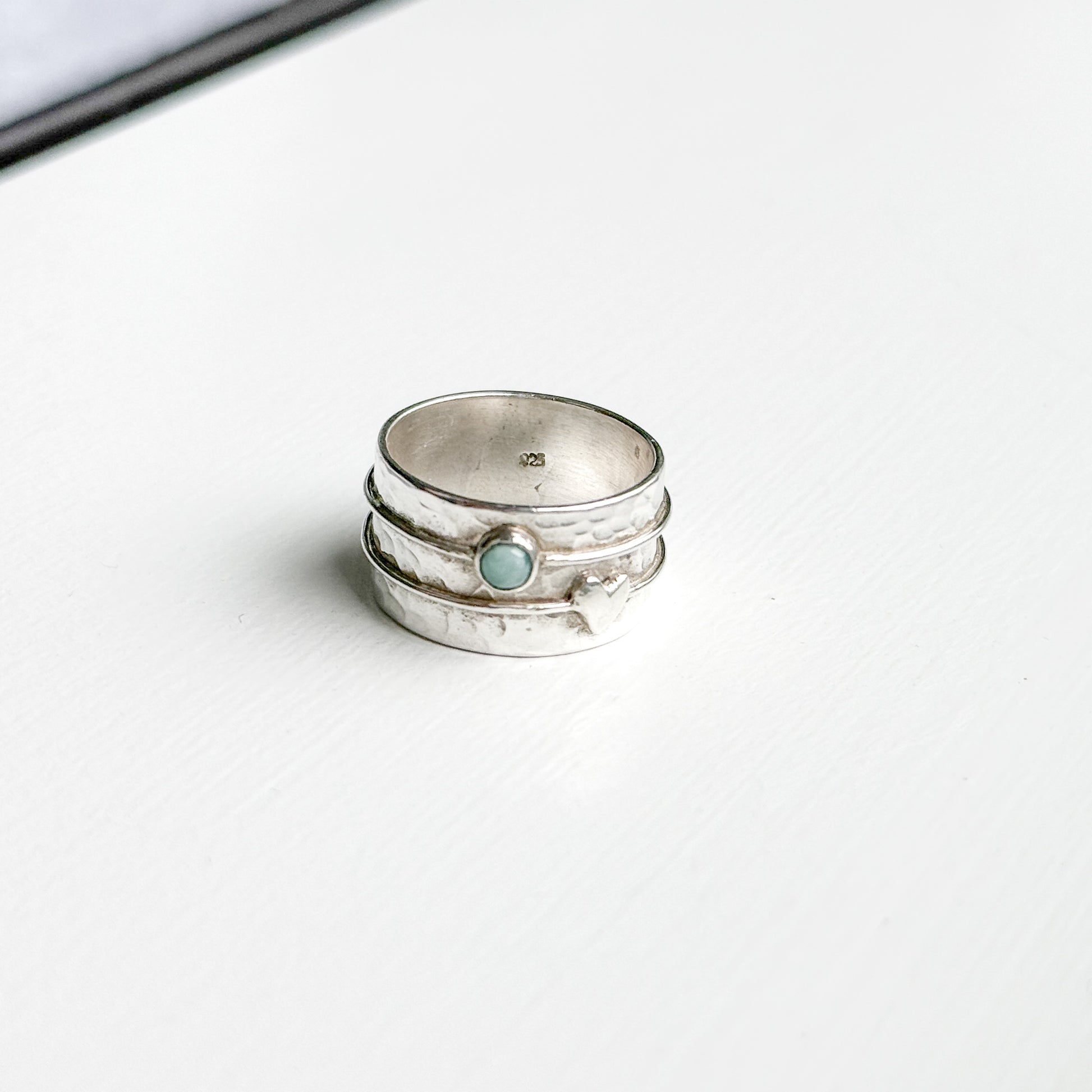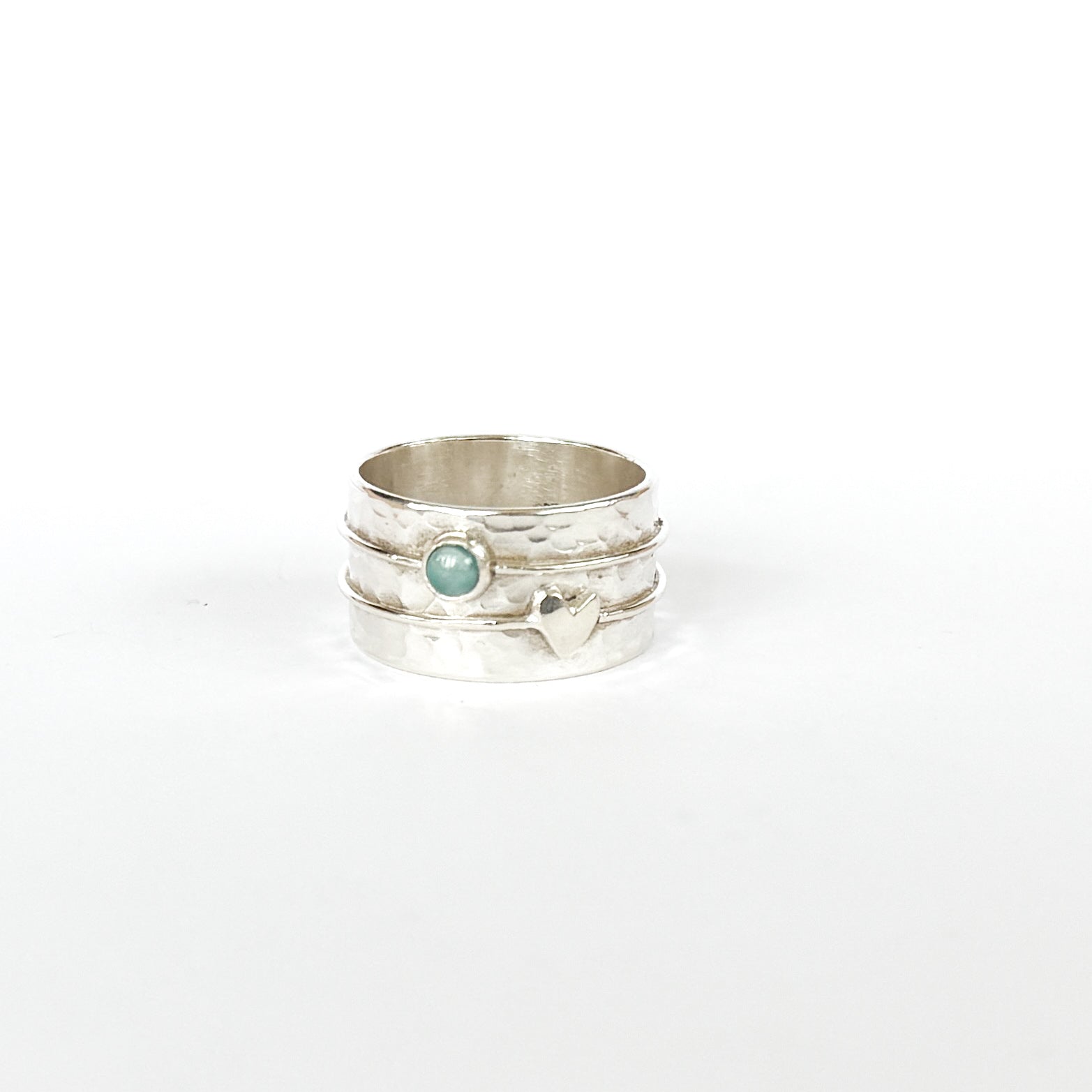 The Carina Ring is bold, unique, and full of heart. With its wide hammered sterling silver band, a carved heart, and a gemstone at the center, it’s a statement piece that feels powerful but still deeply romantic.